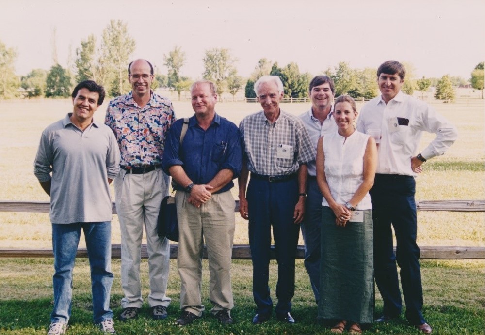 Photo Legend: Dr. Serge Doroshov with his students attending the 4th International Symposium on Sturgeons in Oshkosh, Wisconsin in 2001. From left to right: Javier Linares-Casenave, 1993 MS, 2000 Ph.D.; Frank Chapman, 1982 MS, 1989 PhD; Kevin Kroll, 1990 MS; Dr. Doroshov, Joel Van Eenennaam, 1984 MS; Molly Webb, 1994 MS; 1999 Ph.D.; Ken Beer, 1980 MS.